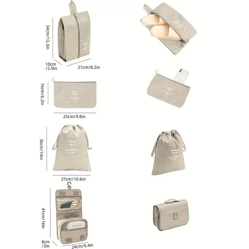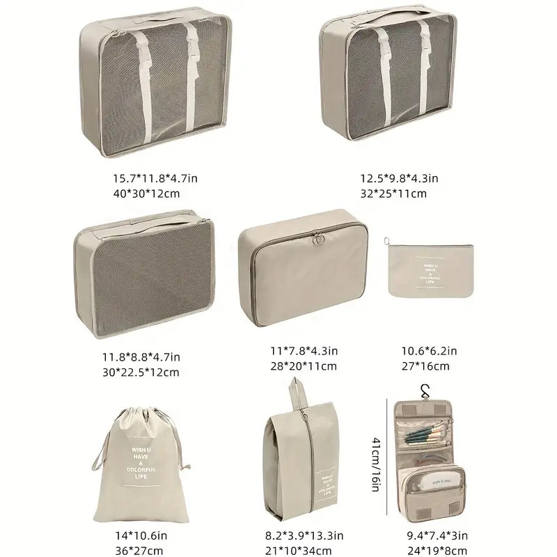 - Travel Packing cube Toiletry Bag set includes 3 different size packing cubes (large:8-10 shirts, medium:5-6 shirts, small: 4-5 shirts), 1 Bra Underwear Bag, 1 Toiletry Bag, 1 Laundry Bag And 1 Zippered Bag . Travel Packing Organizers In Different sizes to meet all your needs. Keep your suitcase neat and orderly, save space and store more items